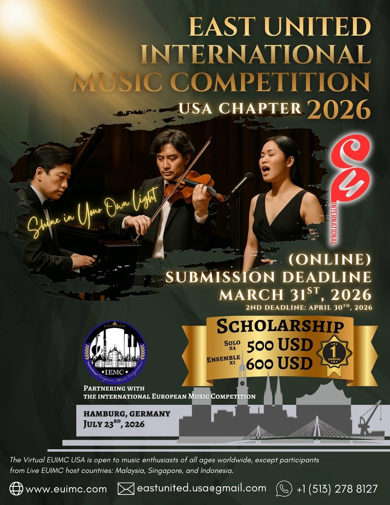 The East United International Music Competition (EUIMC) 2026 celebrates musicians of all ages, levels, and cultural backgrounds. After successful preliminary rounds across Asia in 2025—including Malaysia, Singapore, and Indonesia—the competition is now expanding its reach to the Americas and Europe, inviting even more young artists to share their talent on an international stage.